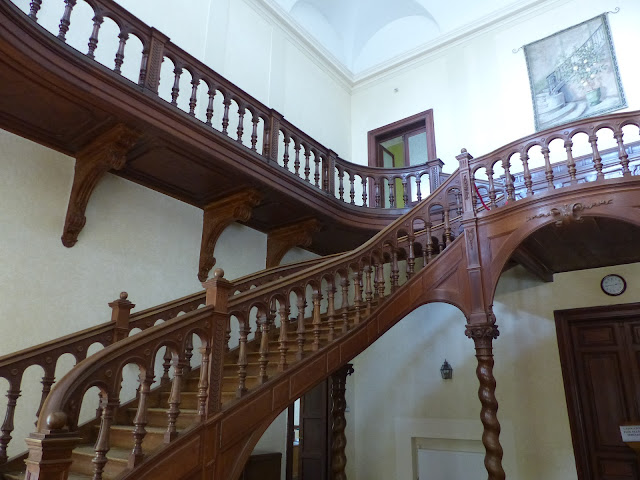 1. kiegészítés: végül is megoldódott a probléma, ezen e hétvégén (2018. 07. 15.) végre meg tudtuk látogatni a kastélyt és a kastélyparkot. Magában a kastélyban nem sok helyiséget lehetett megnézni, azonban a fent jelzett lépcső tényleg nagyon szép volt. A kastélyt egy 30 ha-os park veszi körül, a terület nagy része eléggé elhanyagolt, inkább egy átlagos erdőnek néz ki. A kastély háta mögött található egy rendezettebb rész két tóval. A kastély felől nézve a baloldali egy strand tó, felette canopy jellegű drótkötél csúszópályákkal. A jobboldali tó egy hagyományos parki (?) tó. Figyelem, nem lehet megkerülni, mivel a jobb oldali végén egy csatorna húzódik elég hosszan és nem láttam rajta hidat, ahol vissza lehetne térni a tó partjára.